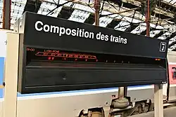 To find your train, locate your train number and the departure time on the departures board. There will be a track ("Voie") number next to the train and departure time. Follow signs to that track to board the train. You will have a reserved seat on TGV trains. On other long-distance trains, you can make reservations (at least one day in advance); if you do not have one you may use any unused seat not marked as reserved. To find your reserved seat, first look for the train coach number ("Voit. No"). Pay attention to the possible confusion between track number ("voie") and coach ("voiture", abbreviated "voit") number. As you go down the track, the coach number will be displayed on an LCD screen on the car, or maybe just written in the window or right next to the doors. Within Paris, on the RER and Transilien networks, four-letter codes (such as COHI, FACA, QYAN, VICK) are generally used in place of train numbers.