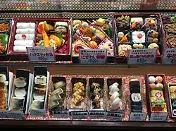 Consider purchasing an ekiben (駅弁), which are packaged meals sold at train stations intended to be eaten on trains. Every large station has several stalls selling ekiben, and even medium-sized stations will typically have some available. Every ekiben is different and represents the taste of the region from where it was packaged. Some major Shinkansen stations such as Tokyo and Shin-Osaka will have stores selling ekiben from all over the country. It's not uncommon for Japanese to pick up an ekiben along with a beer or can of sake and have a mini-party on the train, a custom you could happily adopt. While most ekiben is designed to be eaten cold, there are also self-heating ekiben, usually slightly more expensive, in which you can pull a cord to trigger a chemical reaction that generates heat to warm up the meal.