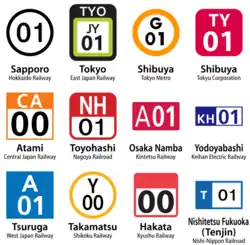 Most railway/subway operators in urban areas show station numbers on signs and transit maps. Station numbers are presented as 1–2 alphabetical characters and a two-digit number starting from 01 or 00, shown in a rectangle or circle color-coded by line or operator. Though a station may have multiple numbers if used by more than one line, each platform sign only shows the one relevant to that line.