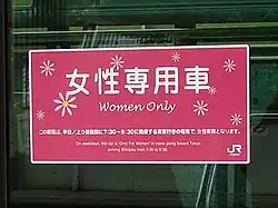 To provide a sense of safety and security for female passengers, many of the JR and private commuter rail lines in Japan reserve a car for women only during the morning and evening rush hour. These cars are identified by special placards and stickers on the train and platform, which also designate the times that women-only cars are in effect. Also, some limited express trains operated by JR West to and from the Kansai region have reserved seats specifically for women and their children. You will find men sitting in "women-only" seats, but they will make way if requested to do so. Normally, the first and last carriages are designated "women-only" during the morning rush time. Some rail companies do allow men with disabilities and their caregivers to board the women-only cars, as well as male elementary school students.