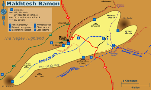 - From the Arava by Jeep or bicycle, the crater can be reached through the Nekarot stream (red-marked dirt road