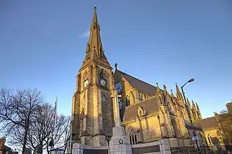 - π Church of St Mary the Virgin, The Rock, Bury BL9 0AH. Anglican parish church on a high point just north of town centre. The previous 16th-century church was replaced in two stages, so the present spire dates from 1842 and the rest from 1876. Note the hammerbeam and tiebeam roof, mosaics, and stain-glass windows. It's a regimental church of the Lancashire Fusiliers, and in 2013 the military funeral of the murdered Fusilier Lee Rigby was held here.