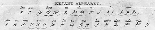 Rejang language has its own native writing system called Buak Jang ꤷꥈꥁꤰ꥓ꤺꥏ (literally means 'Rejang script'), it is the native script commonly used by Rejang people for Rejang language, but these script also used as the writing system for its neighbouring ethnic languages as well, such as Serawai and Mukomuko. Though still used in native documents, and sometimes seen side by side with Latin script in street signs and the names of public buildings, it has been almost totally replaced by the Latin alphabet. A traveller will almost never have to read Rejang script to get information. Makes an awesome tattoo, though.