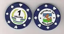- Bank of Molossia, Red Square. Offers Molossia's national currency, the "valora", backed by cookie dough and are issued in both banknotes and coins issued on poker chips.