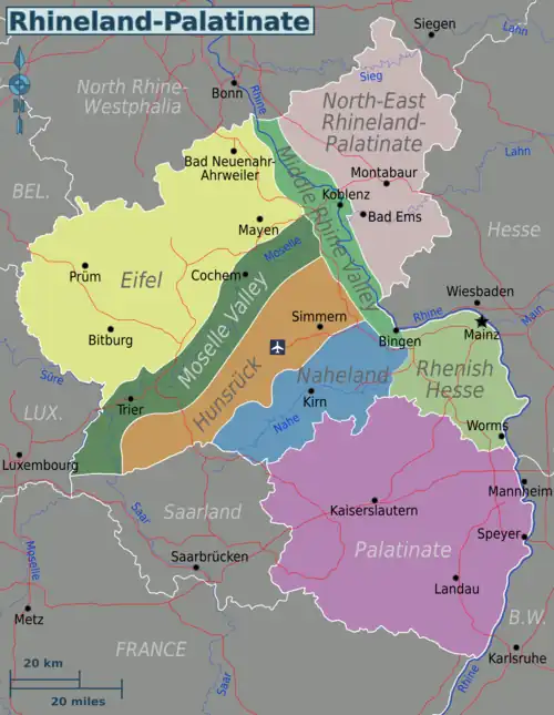 | North-East Rhineland-Palatinate Includes part of Lahn Valley and the Westerwald east of the Middle Rhine Valley and north of the Taunus. A great region for hikers. |