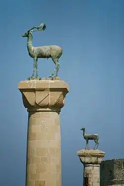Modern bronze deer statues in Mandraki harbor, where the Colossus of Rhodes may have stood