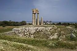 - Temple of Pythian Apollo (on the southern end, just west of a large rectangular terrace). Part of the northeast side of this porous peripteral temple has been restored.