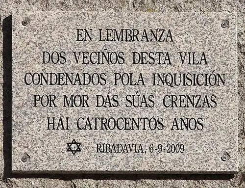 - Casa da Inquisición is the building with crests on its facade, 50 m west of the museum at Rúa Salgado Moscoso 26, corner of Rúa de San Martiño. Circa 1605 several in the town were denounced for secretly practising Judaism, by a fellow called Xerónimo Bautista de Mena, aka "the snitch". The Spanish Inquisition was based here while they set about the holy work of torturing confessions from those named then burning them at the stake; names led to other names, and so on. The crests are those of the Inquisitors, whose snowballing task was not impeded when the snitch was found dead in the street.