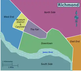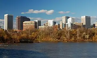| Downtown (includes Shockoe (split into Shockoe Bottom and Shockoe Slip), Jackson Ward and Tobacco Row) Richmond's central business district has many tall towers |