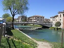 - Remains of the π Roman Bridge on Velino River. Built in the 3rd century AD, it remained the main access to the town until the 1930s, when it became too low on the water level and had to be demolished. The old bridge was laid out on the riverbed, but can still be seen emerging from the water, while a modern bridge replaced it. The nearby area is a very good spot to enjoy Rieti's natural beauties: Velino's water is clear, the riverside is covered by a nice lawn, and ducks use the old bridge as a nest. There are nice cafes and pubs facing the river.