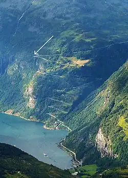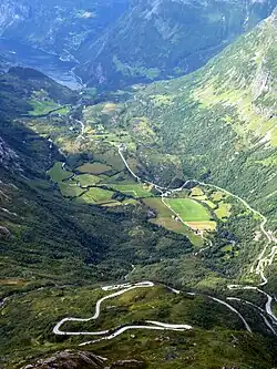 Eagles road (Ørneveien), the road through the mountain pass between Eidsdal and Geiranger, was completed in 1956 and thus created the now continuous road 63. The road up through Eidsdal valley is a long steady climb until the high valley with a picturesque lake. The descent to Geiranger is through the famous Eagle's road with ten hairpin turns and a breathtaking view of the Geirangerfjord. A viewing platform has been installed at the highest hairpin bend (called Ørnesvingen, i.e., Eagle's bend), parking available for a handful of cars. Steep descent to Geiranger village.