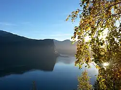 Tafjord is the fjord that stretches east from Valldal village, it is also the name of the small village at the top of the fjord. A local road runs through several tunnels from Valldal village to Tafjord village and further through steep and deep valley beyond. Tafjord hosts the major hydropower plant in the Sunnmøre district, most of the vast hydropower complex is hidden in the mountains, but tall dam at Zacharias lake can be visited by car.