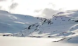 From the highest point of the public road at Djupvatnet (1000 meters) lake, there is a toll road to Mt Dalsnibba (1500 meters) with excellent panorama of Geiranger valley and fjord, as well as the endless sea of mountains around. Dalsnibba is in fact the watershed divide between East Norway and West Norway: Rain falling on the eastern slopes flows 500 km through Gudbrandsdalen and finally into the Oslo fjord at Fredrikstad, while rain falling on the western slopes flow only a few kilometers to the Geirangerfjord below.
