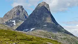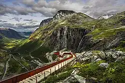 - 🌍 Trollstigen (Trollstigvegen) (Road 63 from Åndalsnes). Late May-October. The road is an impressive piece of construction along the almost vertical cliffs. The road was completed in 1936 and offered for the first time road access from Valldal to East Norway by car or rail (Raumabanen). There are 11 characteristic hairpins. The pass is surrounded by jagged imposing summits, many only accessible for skilled mountaineers and climbers. The Trollstigen pass does in fact sit on the reverse side of the Trollveggen, one of the tallest vertical cliffs in the world. Note: Map coordinates are for the bridge across the waterfall. free.