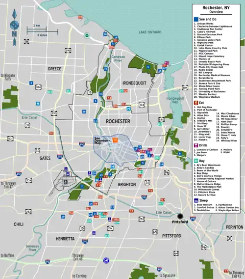 - 🌍 Hilton Garden Inn Downtown, 155 East Main St (Downtown), ☏ +1 585 232-5000. The developers of this five-story property converted three existing historic buildings into a modern 106-room hotel, in the process uncovering and restoring some unique architectural details dating back nearly a century. Their on-site restaurant is Drifters, featuring higher-end comfort food made with local ingredients, and a wine list heavy on Finger Lakes vintages.