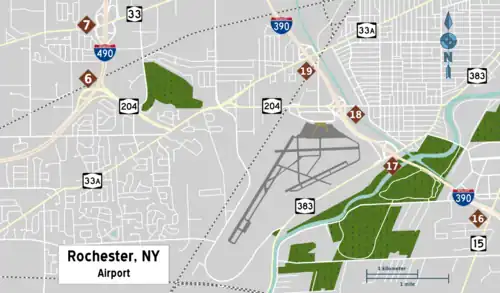 - 🌍 Greater Rochester International Airport (ROC IATA), 1200 Brooks Ave (southwest of the city proper, 6 mi (9.7 km) southwest of downtown, I-390 to Exit 18B or I-490 to Exit 6), ☏ +1 585-753-7000. It's a very nice medium-sized airport, newly remodeled in 2018, with three runways and two concourses. Southwest and Delta see the most passengers, but American, United, and JetBlue also have multiple daily scheduled flights, mostly to their hub airports. There are direct flights to and from Atlanta, Baltimore, Boston, Charlotte, Chicago, Detroit, New York City, Orlando, Philadelphia, Tampa, and Washington, D.C.