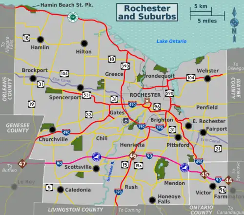 New York State Route 104 is a major east-west route and forms the northern part of the Outer Loop, although it's only an expressway on one side, from the river east. It's also the main feeder route from the northeast and northwest. New York State Route 531 is an expressway that feeds into I-490 on the west side of the county, south of 104.