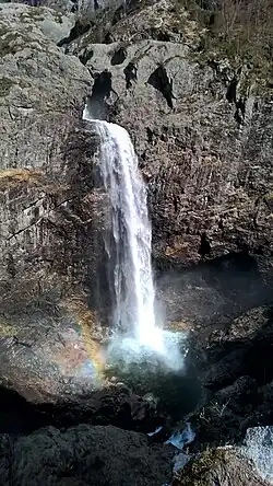 Månafossen has about 100 meters tall and comes out of a hole in the rock face.