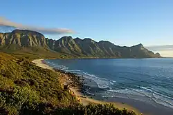 Rooi-els is on the eastern shore of False Bay, just to the south of the mouth of the Rooi-els River, and below the Klein Hangklip peak. There is a very pleasant little beach which is fairly sheltered from south west swells, and is generally safe for swimming. The Rooi-els river flows into the bay at the south end of the beach, and is usually only inches deep and a pleasant place for kids to play.