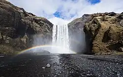 Another short ride will take you to Skógafoss, a waterfall about the same height as Seljalandfoss but much bigger, where a rainbow or two is usually visible on sunny days. The flat bottom enables you to get close to the spray. The top of the waterfall used to be the coastline of Iceland; numerous past earthquakes have receded the coastline to the south of the ring road. A 1-day hike at the Fimmvörðuháls pass to the green Þórsmörk valley that passes the Eyjafjallajökull glacier would start here.