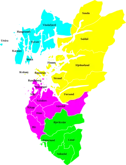 Ryfylke is a district in Rogaland county, Norway. Ryfylke includes the islands, fjords, valleys and uplands around the inner part of the great Boknafjorden.