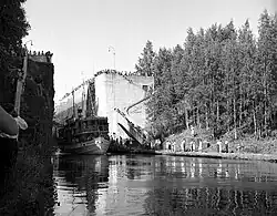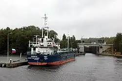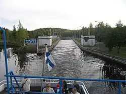 Saimaa Canal (Finnish: Saimaan kanava; Swedish: Saima kanal; Russian: Сайменский канал) is a 43-km-long canal connecting the Saimaa lake system to the Baltic Sea. The canal goes through Finnish and Russian territory. Visitors can sail through it on a canal cruise or by their own craft. In addition it can be explored by car, Highway 13 on the Finnish side and 41K-084 on the Russian side go along the canal and there's a border crossing at Nuijamaa-Brusnichnoye (next to where boats cross).