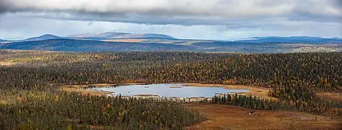 - 🌍 Karhutunturi fell (60 km from the parish village). The 518 m high Karhutunturi fell is a very prominent peak and a popular hiking destination because of its magnificent views. A 5 km long trail to the top, lapp-pole tent on the way. Staying overnight in the tent is possible. The area has no public transportation. The UKK trail visits the fell some 2 km away.