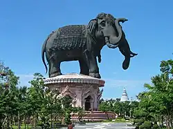 - 🌍 Erawan Museum (พิพิธภัณฑ์ช้างเอราวัณ), Sukhumvit Rd to Samut Prakan (Chang Erawan BTS station), ☏ +66 2 371-3135. 09:00-20:00 daily. The most noticeable landmark in this area is the three-headed elephant. The three storeys inside the elephant contain antiquities and priceless collection of ancient religious objects of Kun Lek Viriyapant who is the museum owner. Its body is made from bronze with a pink pedestal rounded base decorated with millions of small tiles. The body is about 29 m high, and the total height is about 44 m. The design of all three floors represents three worlds. The lower floor is the underwater world, the upper floor is the earth, Kao Prasumain, and the top is the second heaven. 09:00-17:00 adults 400 baht, children 200 baht; 17:00-20:00 adults 200 baht, children 100 baht.