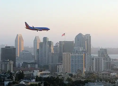 - 🌍 San Diego International Airport (SAN IATA) (less than 10 minutes from downtown San Diego). The descent into the airport from the east comes remarkably close to downtown buildings, which can be a bit alarming for first-time visitors. Alaska Airlines and Southwest are the dominant airlines at San Diego. The airport has international flights, mostly from Mexico and Canada but also Munich, London–Heathrow, Tokyo–Narita, and Zurich. Visitors to California from other countries will most likely travel through Los Angeles (LAX IATA) or San Francisco (SFO IATA). However, San Diego has non-stops from Hawaii (via Alaska Airlines, Hawaiian Airlines, and Southwest Airlines), most major American hubs including Atlanta, Chicago–O'Hare, Dallas, Houston, New York–JFK, and some smaller non-hubs. If traveling from Mexico, it may be advantageous to fly into Tijuana on a domestic flight and then take the CBX Pedestrian Bridge directly from the airport into San Diego. This allows you to skip the border crossings in San Ysidro with its lengthy delays.