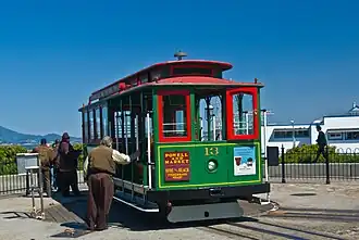 - Cable Car, Powell-Mason Line from Taylor & Bay or Powell-Hyde Line from Beach & Hyde (at Hyde St and Beach St), ☏ +1-415-981-6300, comments@sfcablecar.com. This is fun way to enter or leave the Wharf area. For your convenience, two cable car lines terminate at Fisherman's Wharf — one at Hyde St & Beach St and one at Bay St & Taylor St. $7 each way ($3 for seniors or disabled before 7AM and after 9PM); day passes available and MUNI passports applicable.