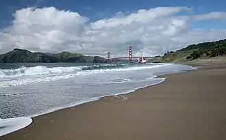 - 🌍 Baker Beach, Gibson Rd (along Lincoln Blvd and Bowley St), ☏ +1-415-831-2750. A beautiful, immaculately kept 1-mile stretch of beach, set just behind the Golden Gate Bridge. Unfortunately, due to strong currents, the beach is not very safe for swimming, but for "land-lovers" it does have many outdoor barbeques and designated picnic areas to eat and relax at. Toward the northern end of the beach there is also an unofficial nude section that mainly seems to attract gay men. It has free parking and clean restrooms.