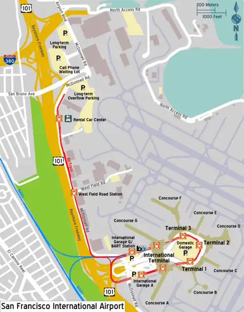 - The Red Line circulates the terminals plus the International Garages, Grand Hyatt Hotel, and BART train station at parking Garage G. This loop route travels clockwise.