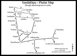 The trek route passes through the Singalila National Park. Both Sandakphu and Phalut are connected by drivable road from Manebhanjan however a trek route also exists. The trek route is different from the motorable road however they do overlap at many places. The entire route has lodges and tea houses serving meals. The route is open to trekking, jeep tour or a combination of both.