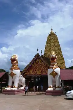 - Wat Wang Wiwekaram and Chedi Buddhakhaya - Walk over the bridge to the Mon village, and bear left parallel to the lake. After 2 km the concrete road forks. Left goes to the huge golden chedi, with a small Burmese goods market below it, and right goes to the main Wat Wang Wiwekaram. The wat was built by the late Phara Uttama, who was one of the most important monks in Thailand, and is still highly revered in the Mon community. There is a large, ornate viharn at the main wat, and in another building there are murals depicting stages of the Buddha's last, and previous, lives. You may wish to hire a taxi as it's quite a long walk and it is easy to get lost in Wangka village (although people are happy to point you in the right direction).