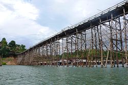 - Saphan Mon (สะพานมอญ) - The 400 m wooden bridge (other sources claim it's 800 meters long) has been there since the mid 80s. It's the longest wooden bridge in Thailand and was destroyed in July 2013 but fully repaired. There is a small cafe on one end which is a great spot for a drink and a view. Donation boxes at either end help with maintenance for the bridge; donate and you will also receive a great photo in return. Local kids like to jump off the bridge into the lake.
