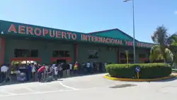 Getting there: Travelers connecting with all-inclusive resorts and tours will often board buses in the parking lot across the street from the airport. Independent travelers can sometimes find taxis but more likely will need to rent a car or arrange for the 16 km (30 min) car ride to town from the operators of the rental car company at the airport. One should expect to pay approximately US$20 for the ride.