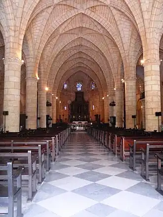 - Colonial Zone. Santo Domingo was the first major European settlement in the New World. Christopher Columbus walked these streets! Check out the many examples of 15th and 16th century architecture in the Colonial Zone. Don't miss the Ozama Fort (built within Columbus's lifetime), the Alcazar de Colon, and the Cathedral, all dating to the early 1500s. You can also check beautiful churches and convents, such as the Iglesia Regina Angelorum and the Convento de los Dominicos. Don't miss the Panteon Nacional, where the national heroes are buried, in the Calle Las Damas, the New World's first (European) street! Also, walk up the Calle del Conde, a very old pedestrian shop-lined street that used to be the commercial heart of the city. This street leads to the Puerta del Conde, where the Dominican Republic proclaimed its independence from Haiti, and the Parque Independencia, where the country's founding fathers' remains are kept at the Altar de la Patria. On Sunday evenings, check out the Ruinas de San Francisco for live bands playing Merengue, Bachata, Salsa and Son, in a wonderful weekly show where both locals and tourists dance, drink and enjoy themselves. This would be an unforgettable experience! Also check out La Atarazana street after dark for a variety of romantic outdoor cafes with a spectacular view of the Alcazar and bay area. One such brasserie, Pat E Palo, has operated uninterrupted since 1505. Check out the house where Ponce DeLeon lived before he embarked upon his quest for the fountain of youth and ended up discovering Florida.