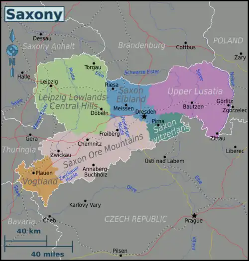 Saxony (Sachsen) is a federal state in the east of Germany. It contains the two largest and most important cities in eastern Germany other than Berlin: Leipzig and Dresden. The state has a long history of independence as a kingdom (much like Bavaria), and as a result has a strong sense of self-identity. It is home to many historic towns and cities and also the eastern German mountain range, the Ore Mountains or "Erzgebirge" which it shares with the Czech Republic to the south. It also shares international borders with Poland and the region of Silesia to the east. Görlitz, a town divided by World War II along the Oder-Neiße line is also the easternmost point of Germany.