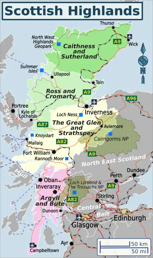 - - A82 from Glasgow by Loch Lomond to Crianlarich, Glencoe, Fort William and Loch Ness to Inverness, with A87 branching for Skye.