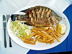 Tilapia zilli (redbelly tilapia, "St. Peter's fish"), served in a Tiberias restaurant