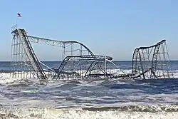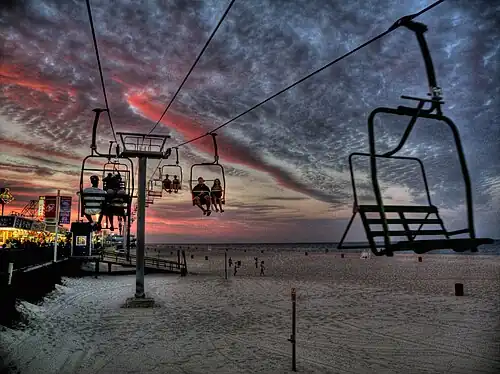 Seaside Heights is a borough with almost 3,000 residents (2019) in the New Jersey Shore region. Seaside Heights is a beach town on a barrier island that faces the Atlantic Ocean on the east and Barnegat Bay on the west. It is connected to the mainland community of Toms River via the Thomas A. Mathis Bridge (New Jersey Route 37) over the bay. Seaside Park, directly to the south on the same island, is also covered in this article.