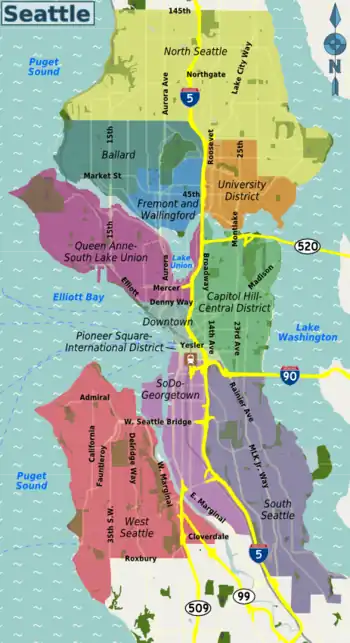 | Ballard A mostly residential area, home to the canal locks. The area is known for its Scandinavian heritage, chic boutiques, and the thriving historic Downtown Ballard. |