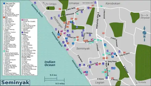 - Made's Warung, Jl Raya Seminyak, β +62 361 732130. 11:00-23:00. A Seminyak institution that was established (in a different location) in 1969. Wonderful Indonesian food in a great location in a courtyard off of the main road in Seminyak. The western food is OK but nothing special; stay with the Indonesian dishes. Certainly not over-priced by Seminyak standards.