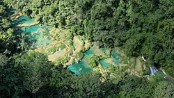 Semuc Champey is a set of crystalline pools over the Río Cahabón in Alta Verapaz, Guatemala. It consists of a natural 300 m limestone bridge, under which passes the Cahabón River. Atop the bridge is a series of stepped, turquoise pools, a popular swimming attraction. Semuc is part of the backpacker trail in Guatemala.