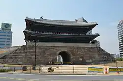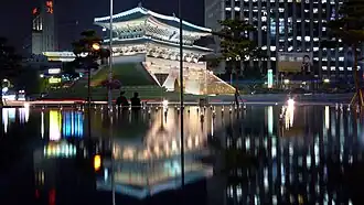 - ๐ Namdaemun Gate (๋จ๋๋ฌธ, ๅๅคง้) (Metro Line 1, City Hall station). The Great South Gate is an iconic symbol of Seoul and has been designated as National Treasure Number 1. Particularly beautiful when floodlit at night, and best combined with a visit to the adjacent Namdaemun Market. Much of the structure was destroyed by arson in 2008, although a faithful reconstruction was completed in 2013. Formally known as 'Sungnyemun' (์ญ๋ก๋ฌธ, ๅด็ฆฎ้). The other city gates can be found in the neighboring Jongno district.