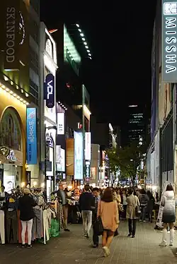 - ๐ Myeong-dong. Probably the best-known shopping area. It is definitely the most tourist-friendly fashion area. In spring and summer, fashion models/sidewalk promoters can be seen strolling the streets of Myeongdong promoting various cosmetics, stores or other fashion-related products. Many regular people also tend to catwalk their newest outfit on these streets. Rows of stores are available to look for that perfect accessory, and most of Korea's major brands can be found here: mVIO, Caspi Conus, WhoAU California, AHM, So.Basic, Noxon, Basic House, UGIZ, 1492, nipper, hang ten, A6, Bean Pole, Jambangee, Giordano as well as a few international brands such as Lacoste, Land Rover, Adidas, Gap, Zara, Koolhaas, Uniqlo, Anna Sui, and Forever 21. Nearby are the Lotte and Shinsegae department stores. Excellent street food carts are all around from around 17:00.