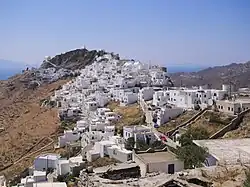 Serifos is a small island (65 km2, pop. about 1,200) where tourism is just beginning to really develop. Its main attractions are some excellent beaches, and an unspoiled whitewashed cubistic traditional Cycladic Chora (main town). By far the most notable episode in the island's past is not from history but from mythology: here was where the hero Perseus was said to have used Medusa's head (one of the three Gorgons) to turn King Polydeuctes to stone, thus saving his mother Danae from the king's violent advances. Copper and other minerals have been mined here since Minoan times and only stopped being exported in the 1960s; in some places on the island you can still see the straight roads with railway-like iron tracks which were used for animal-hauled ore carts. Serifos was a significant city-stae in classical Greece and played a part in the Persian and subsequent wars. The Romans used it as a place of political exile. In subsequent history, Serifos has been pretty much a backwater. The island is more barren than even most of the Cyclades, despite the fact that it well watered by natural springs.
