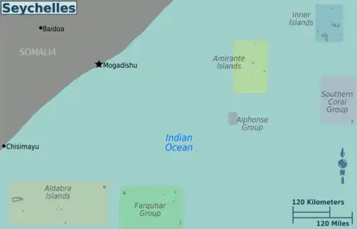 The Seychelles (Seychellois Creole: Sesel) is an island nation in the Indian Ocean, northeast of Madagascar and east of Kenya. It consists of 115 islands, of which the largest are Mahe, Praslin, and La Digue. The capital and largest city is Victoria, located on the island of Mahe.