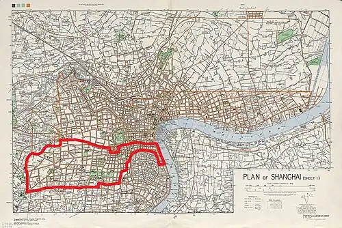 Shanghai in 1935, with French Concession outlined in red. The eastern part of it wraps around the Old City