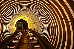 - Bund "Sightseeing" Tunnel. A slow-moving tram, through a comically low-tech tunnel with bizarre commentary in English and Chinese. It is marketed as a Sightseeing Tunnel, however there are no sights other than 80s-era rope lights, lasers and some inflatables that look as though they belong in a car dealership. It is a rather surreal experience. This is the fastest way of crossing between the Bund in Puxi and the Pearl TV Tower in Pudong but also the most expensive; it is essentially a tourist trap. After arriving you'll be dropped off in a hall full of tourist-trap shops, which should come as no surprise since the entrance is a few meters from the TV Tower and this is a mode of transportation that locals rarely use. Not recommended for those sensitive to strobe lights or mediocrity — unless you are prepared to spend some cash to look at flashing lights instead of walking 5 minutes to the South and taking the ferry or walking 5 minutes West to Nanjing Road East metro station and taking the Metro. On the other hand, it is also significantly less packed than either of those during peak hours. ¥45 one way/¥60 return.